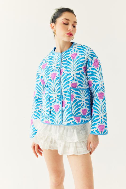 Bisiklet yaka, uzun kollu, biyeli, kendi kumaşı kaplı çıt çıt kapama