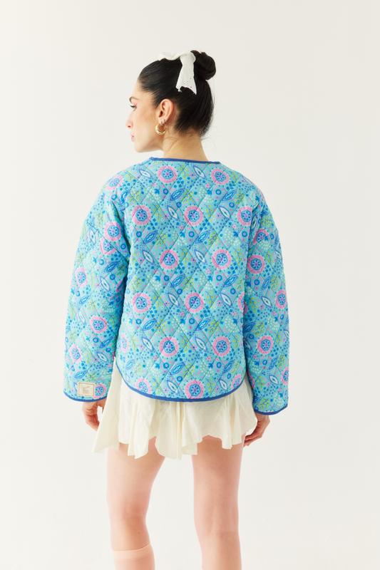 Bisiklet yaka, uzun kollu, biyeli, kendi kumaşı kaplı çıt çıt kapama